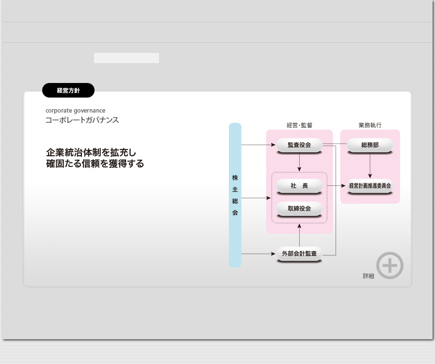当社は、コーポレートガバナンス(企業統治)をよりいっそう充実させ、経営の迅速化と健全化、およびコンプライアンスを軸とした尊法性を確保いたします。また、各ステークホルダーである、お客様・株主様・金融機関に、より確固たる信頼を得るために、説明責任の重視とその適用徹底を進めてまいります。